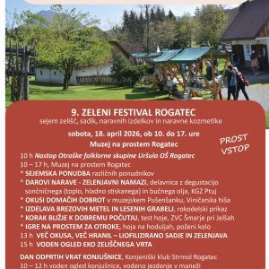 Pojoče perice, pranje perila na štepihu – Ljudske pevke KD Anton Stefanciosa Rogatec Taberh s prikazi delovnih opravil – mlačev žita s cepci, na ročni mlatilnici, košnja trave – kosci in grabljice Žaganje hloda – Prešmentani falotje Podkovanje konjev – kovač pred muzejsko kovačijo Rokodelstvo; pletenje iz ličja in šibja, predenje, tkanje, vezenje in pletenje Ljudski plesi – Folklorna skupina: KUD Lojze Avžner Zg. Ložnica Okusimo dediščino – doživljajske delavnice Muzeja na prostem Rogatec; izdelava rožic iz krep papirja in pletenje zapestnic iz ličja ter peka žulik v krušni peči Marjetin rokodelski sejem v sodelovanju rokodelci in slovenskimi rokodelskimi centri Slovenije Naj sirova zavihanka Obsotelja in Kozjanskega – izbor, razstava in pokušina sirove zavihanke Ložniške ufarce / Gostinska ponudba / Prijetno druženje ob petju in glasbi https://www.rogatec.si/27-likof-na-taberhi-etnografska-prireditev-v-muzeju-na-prostem-rogatec/ Organizator: Zavod za kulturo, turizem in razvoj Rogatec