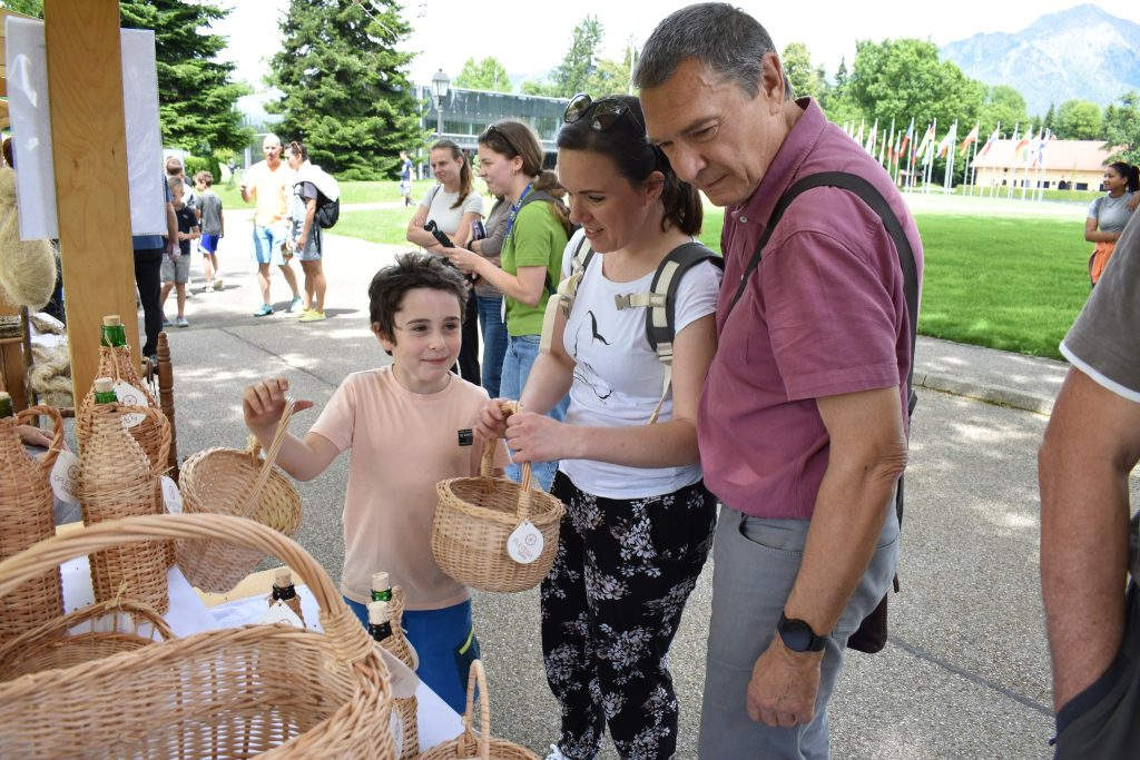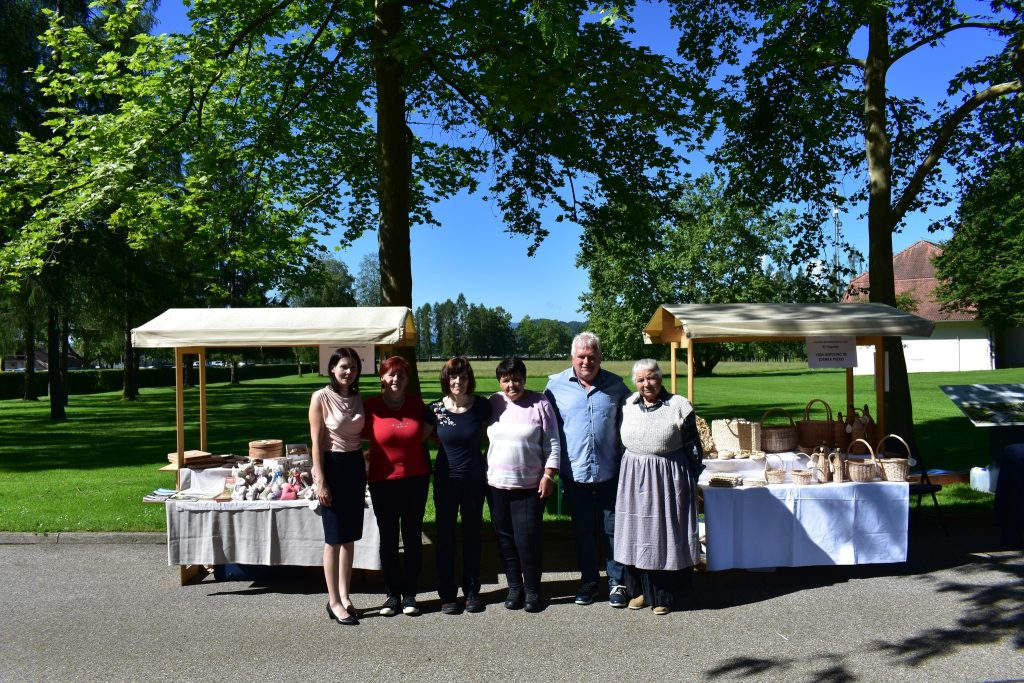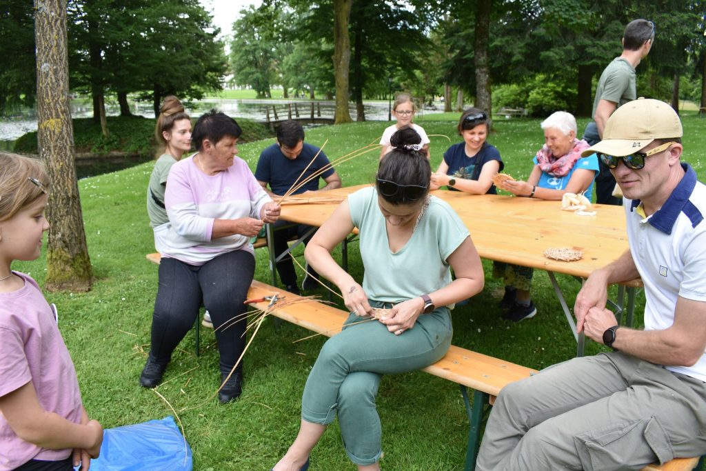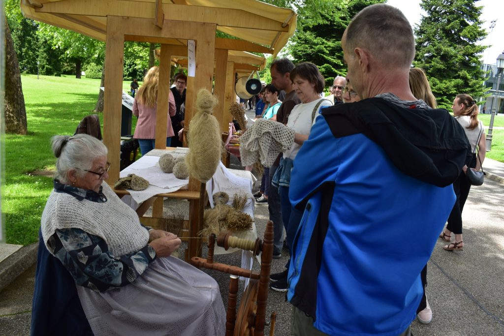 Na stojnicah smo predstavili naše izdelke in pletenje iz ličja ter predenje na kolovratu. Izvedli smo še tri rokodelske delavnice, pletenje podstavka iz šibja, tkanje zapestnice na tkalskem glavniku in slikanje steklenega obeska.