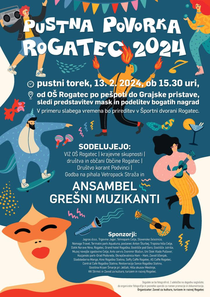 Na pustni torek, 13. 2. 2024 s pričetkom ob 15.30 uri se je od OŠ Rogatec po pešpoti do Grajske pristave vila Pustna povorka Rogatec2024. Sodelovali so učenci in učitelji VIZ OŠ Rogatec, Kulturno društvo Anton Stefanciosa Rogatec, Društvo koranti Podvinci, Godba na pihala Vetropack Straža in Ansambel Grešni muzikanti. Na odru pred Gajsko pristavo so se pustne maske, skupinske in posamezne, predstavile. Komisija je njihovo izvirnost nagradila z lepimi nagradami donatorjev.