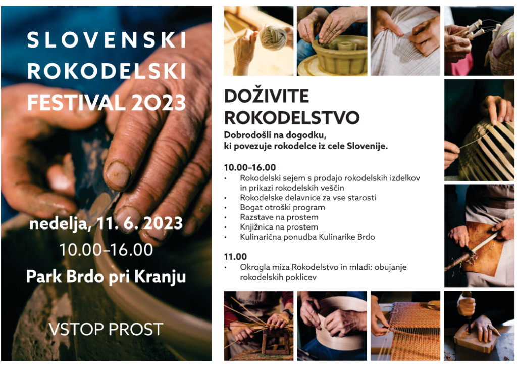 Slovenski rokodelski festival je festivalski dogodek, ki od leta 2015 povezuje prireditve regijskih rokodelskih centrov, članov Konzorcija rokodelskih centrov Slovenije. Dogodki vsako leto potekajo od maja do novembra, letos pa mreži dogodkov dodajamo še osrednji vseslovenski rokodelski dogodek, ki bo v nedeljo, 11. 6. 2023, med 10. in 16. uro potekal na Brdu pri Kranju.